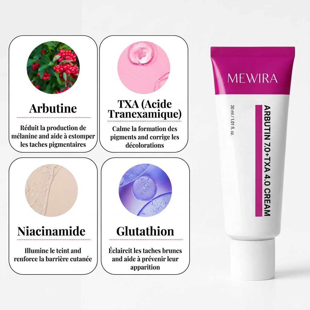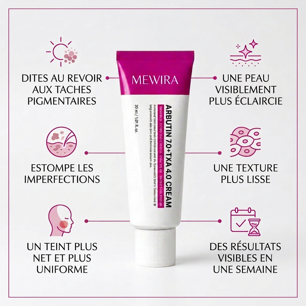 Cette crème coréenne, inspirée par les dermatologues, associe 7 % d'arbutine et 4 % d'acide tranexamique pour atténuer visiblement les taches brunes, les cicatrices d'acné et le teint irrégulier. Enrichie en extraits botaniques apaisants et en niacinamide, elle contribue à révéler une peau lisse et lumineuse, un véritable « teint de porcelaine », dès la première utilisation.
